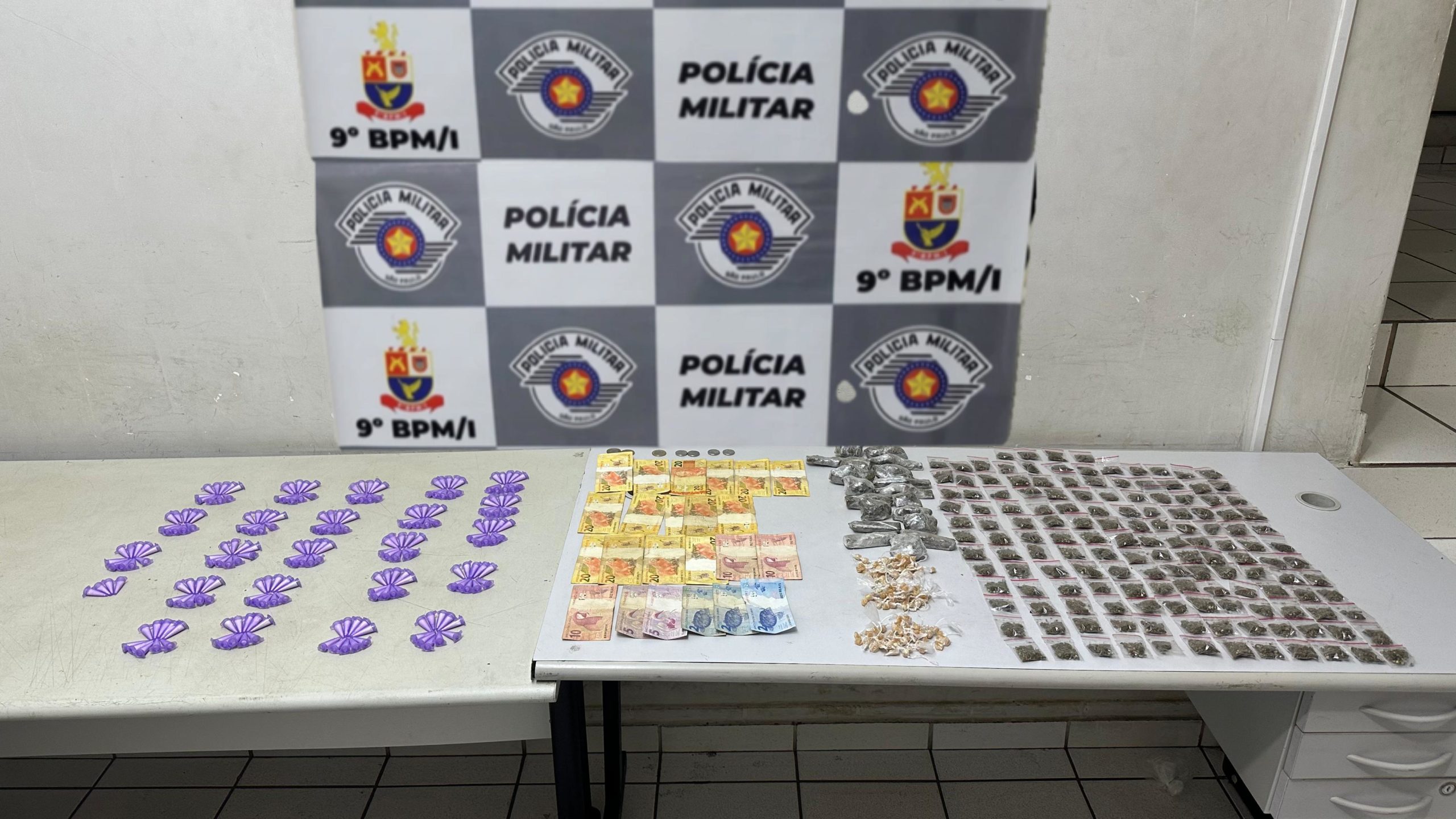Ao perceber a aproximação da viatura, ele tentou fugir, mas foi contido e revistado. Durante a abordagem, os policiais encontraram na sacola R$ 351 em cédulas diversas, 148 porções e 19 tabletes de maconha (604 g no total), 153 pedras de crack (59 g) e 234 microtubos com cocaína (271 g).
