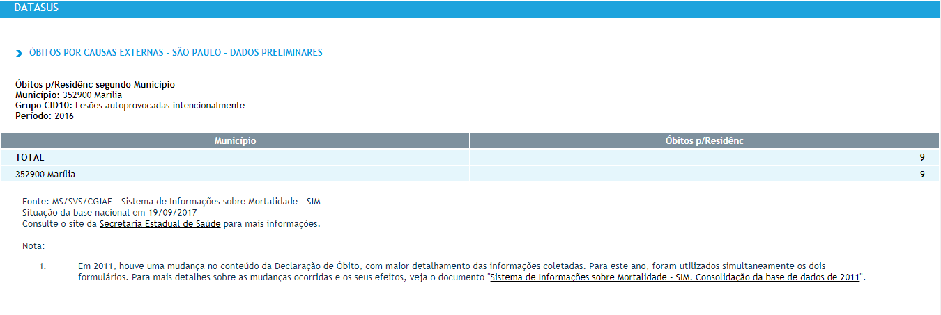 Dados preliminares do Data SUS (Departamento de Informática do Sistema Único de Saúde) mostram que em 2016 foram 9 casos de suicídio no município de Marília. Ainda não estão disponíveis informações sobre 2017.