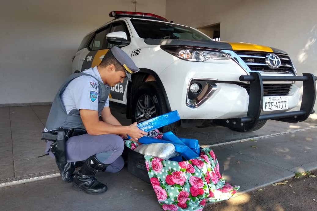 Diante dos fatos, foi feita uma vistoria nas bagagens de mão da suspeita e nada de ilícito foi localizado, porém ao verificar sua bagagem do compartimento externo do veículo, foram encontrados dez tabletes de maconha e 14 pacotes de skank.