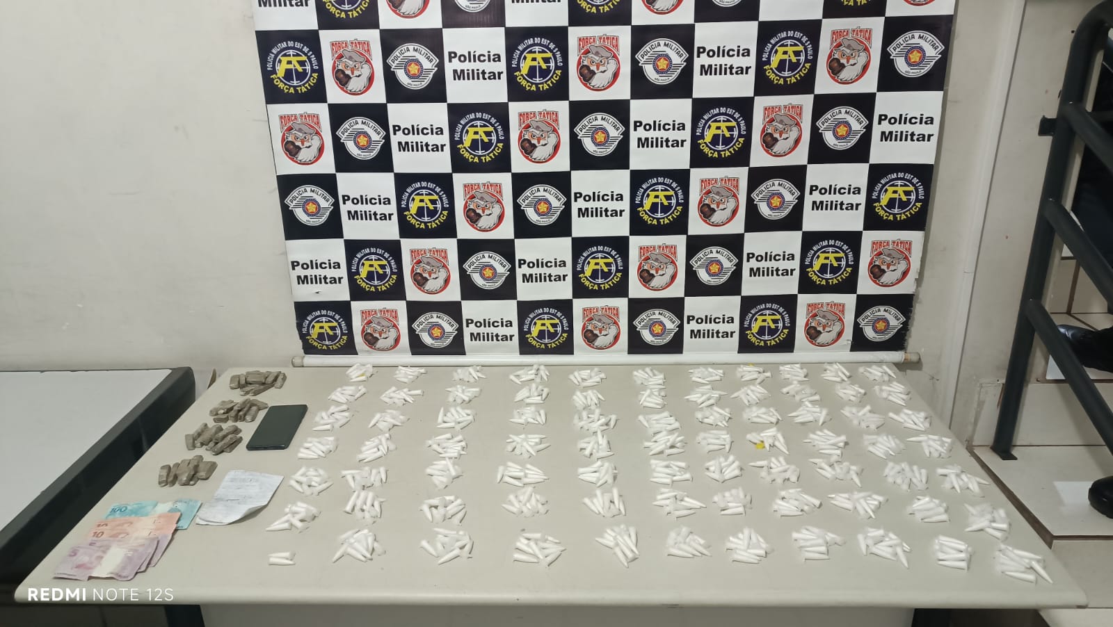 Na sacola, foram encontrados 762 microtubos de cocaína, totalizando cerca de 1,5 quilo da droga, além de 37 porções de maconha, com peso aproximado de 178 gramas. Também foram apreendidos R$ 135 em dinheiro, um celular Samsung sem chip e uma folha com anotações sobre o tráfico.