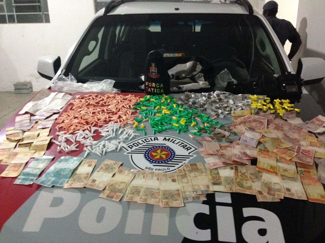 A Força Tática da Polícia Militar prendeu em flagrante Mauricio Aparecido do Nascimento dos Santos, de 19 anos, na favela da Vila Barros, com aproximadamente 900 pinos de cocaína, 100 porções de maconha e R$ 2 mil em dinheiro.