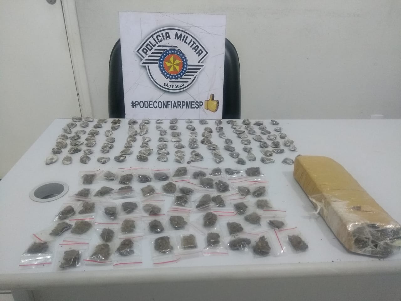 Em revista no veículo, os militares sentiram um cheiro forte de maconha e, com auxílio de cachorros do Canil da PM, foram localizadas 153 porções de maconha embaladas atrás do painel do veículo e um tijolo de maconha sob o carpete da canaleta.