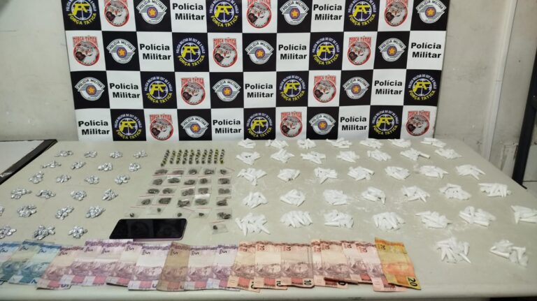 Durante a abordagem, os policiais encontraram com o jovem um celular, cerca de R$ 144 e diversas porções de drogas. Foram apreendidas 78 volumes de maconha, 239 de crack e 380 tubos plásticos com cocaína.
