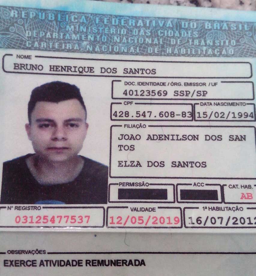Com os dados pessoais de Bruno, foi confirmado que sua verdadeira CNH estava cassada. Ele confessou que comprou o documento falso no bairro do Brás, em São Paulo, por 1.500 reais.