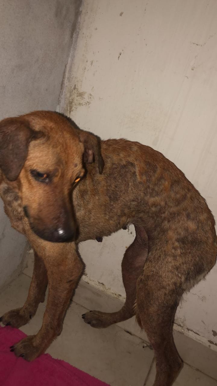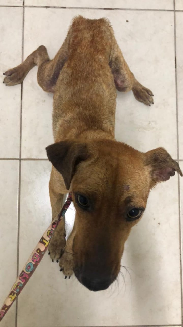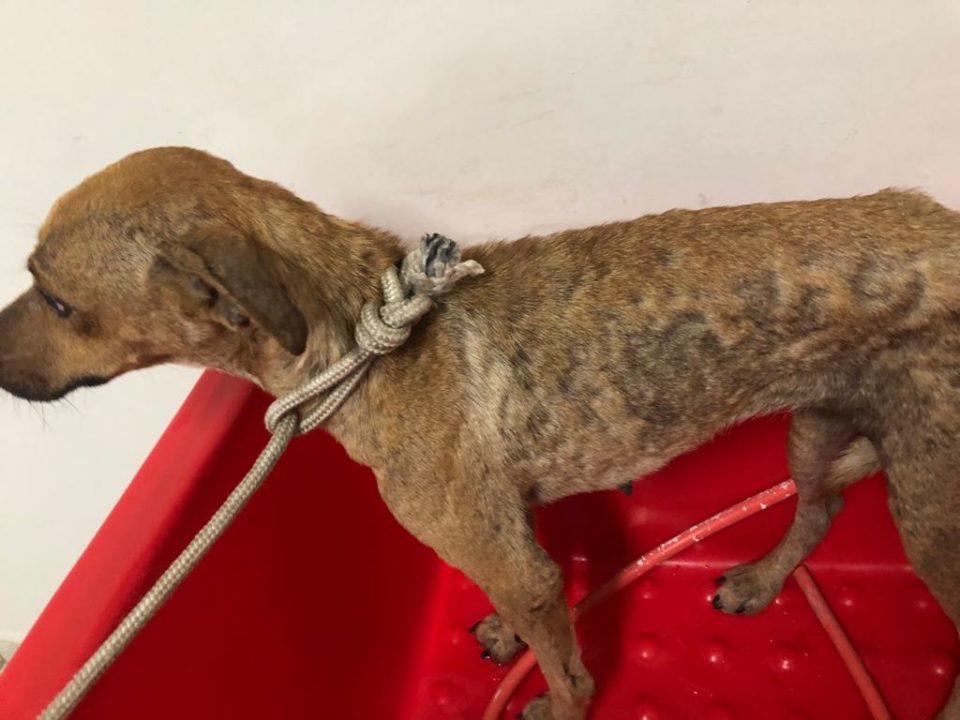 Ontem, depois de nova denúncia, a ONG constatou junto com a médica veterinária que a cadela, de aproximadamente dois anos, estava caquética, sem alimentação e sarna pelo corpo todo.