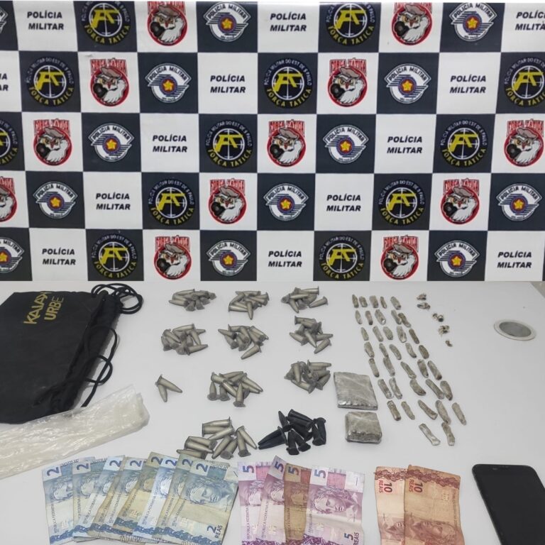 Ao perceberem a presença policial, ambos fugiram, mas o jovem foi localizado após um cerco. Na abordagem, foi encontrado com ele uma bolsa, segundo a PM, 102 pinos com cocaína, 39 porções de maconha, 22 de haxixe, além de R$ 58. Também foi apreendido um celular.