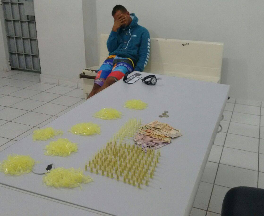 Foram localizados pelos militares 147 pinos de crack, 330 cápsulas vazias que serviriam para acondicionar o entorpecente e 295 reais em dinheiro. O jovem foi preso em flagrante e agora fica à disposição da Justiça.