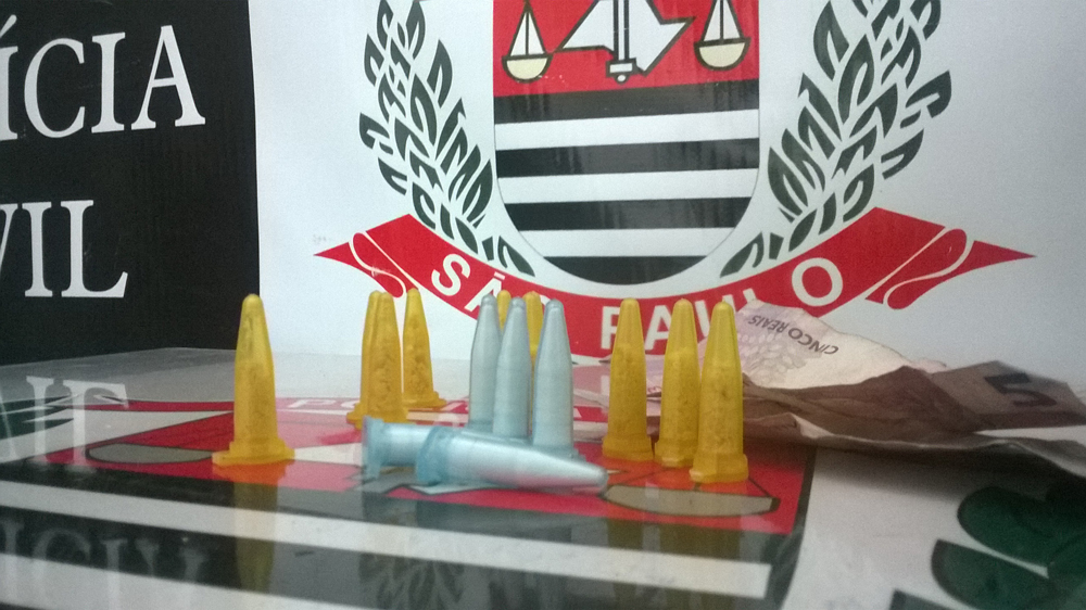 Com o jovem, foram localizados 5 pinos com cocaína e apenas R$ 10 em dinheiro. Na casa abandonada, onde o indiciado fora visto adentrar e sair, num corredor, escondido em entulhos, foi localizada uma “muca” contendo 10 pinos com crack.