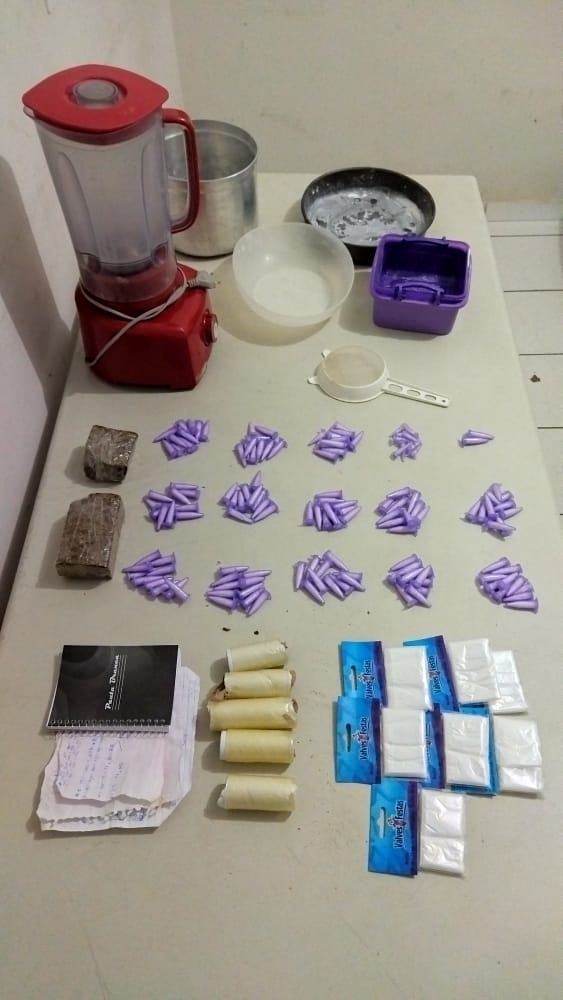 A PM foi até o imóvel e no quarto do jovem encontrou 142 pinos com o entorpecente, tijolos de maconha, um caderno com anotações do tráfico, papel filme, um liquidificador, saquinhos plásticos e um celular.