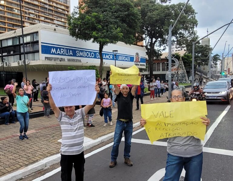 Terceirizados protestaram pelo segundo dia consecutivo em frente ao Paço Municipal (Foto: Alcyr Netto/Marília Notícia)