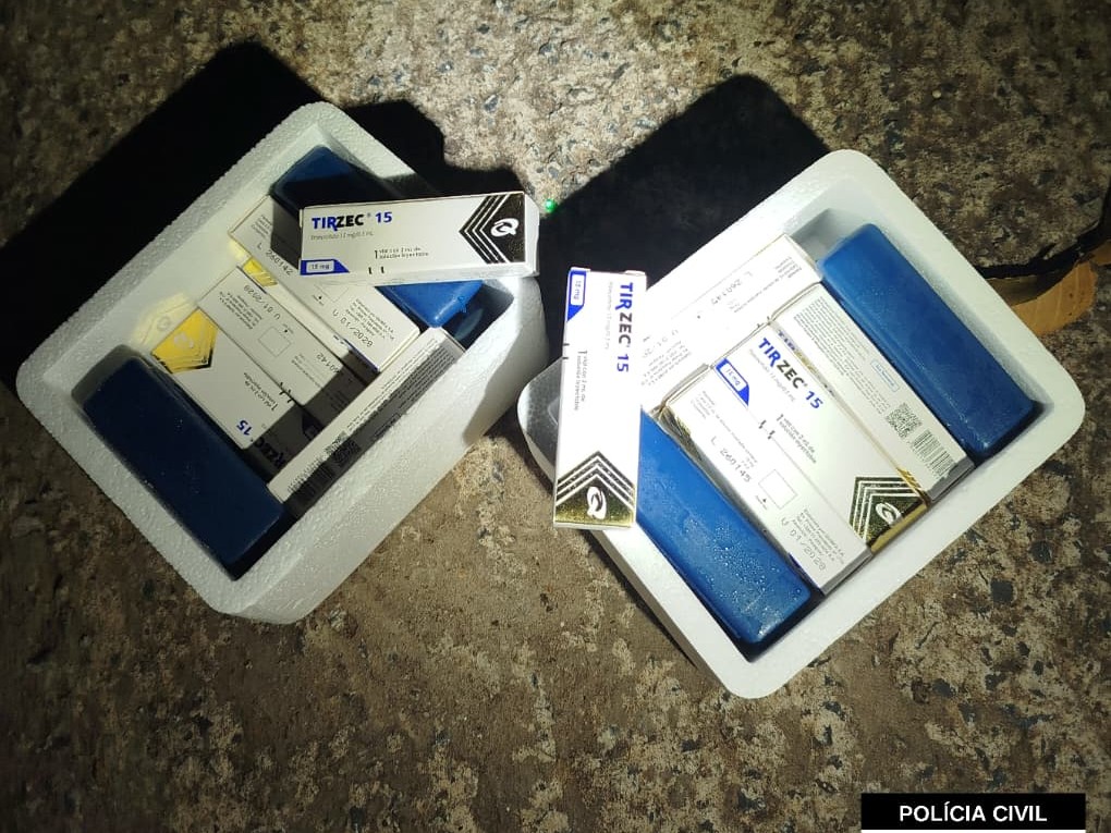 Foram apreendidos 14 frascos do produto identificado como TirZec 15, cujo princípio ativo é a tirzepatida, substância que não possui registro na Agência Nacional de Vigilância Sanitária (Anvisa). Segundo a polícia, o medicamento é considerado proibido no país e pode representar risco à saúde.