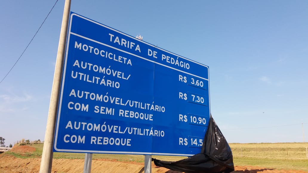 Placa com preços da tarifa cobrada dos veículos que transitam na SP-333 (Foto: Marília Notícia/Leonardo Moreno)