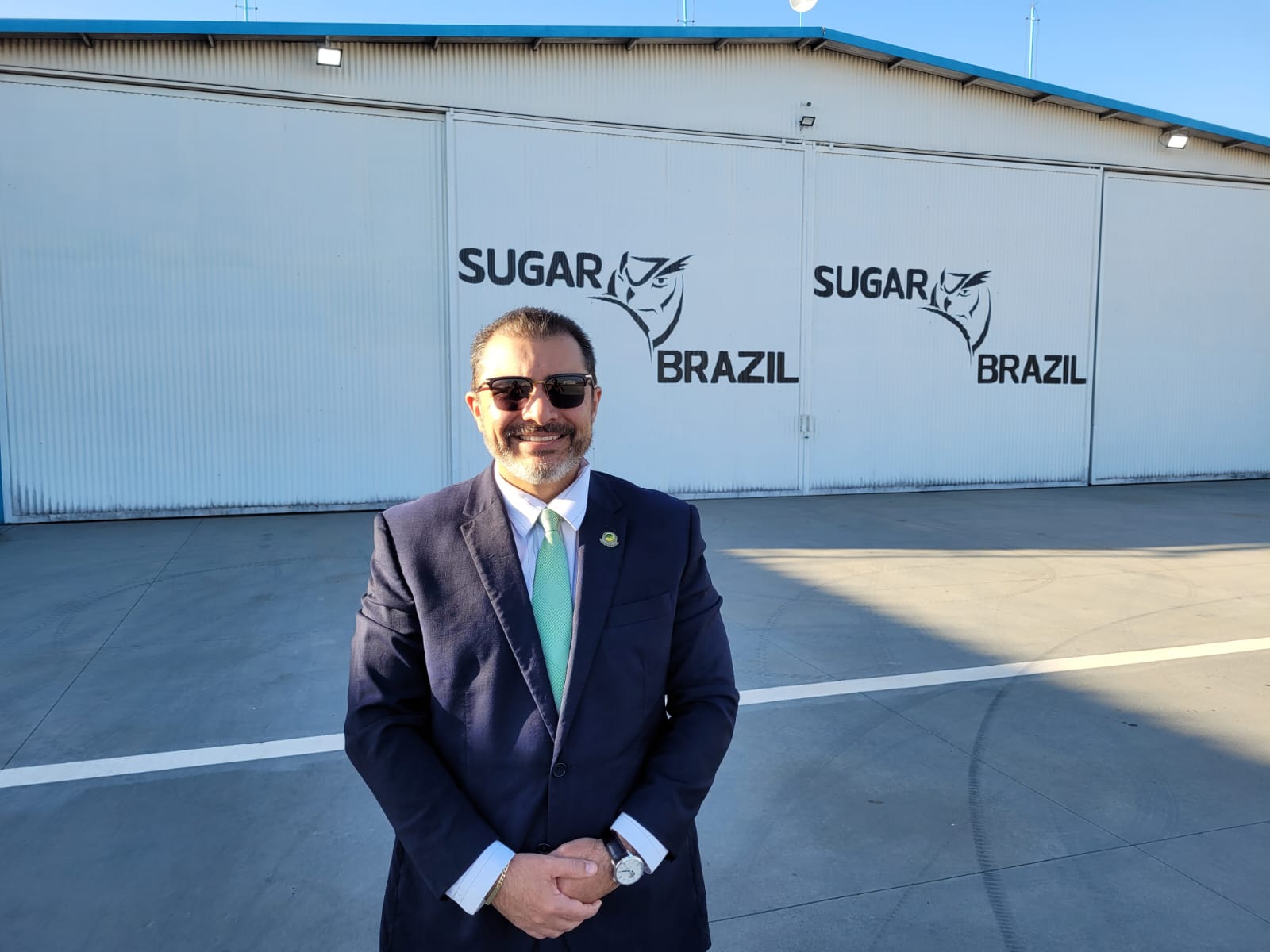 João Pinheiro em frente ao hangar da Sugar Brazil em Marília (Foto: Alcyr Netto/Marília Notícia)