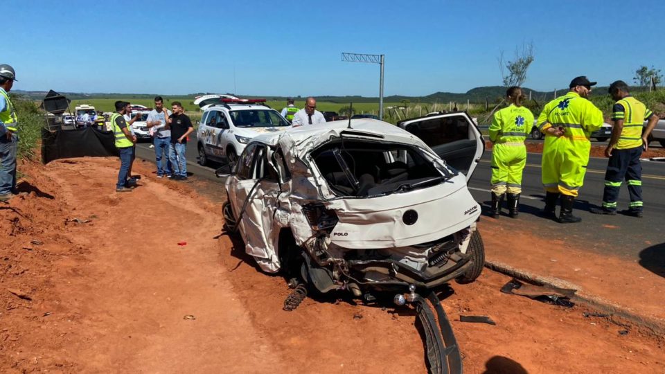 Carro foi atingido por um caminhão ao tentar cruzar a rodovia (Foto: Daniela Casale/Marília Notícia)