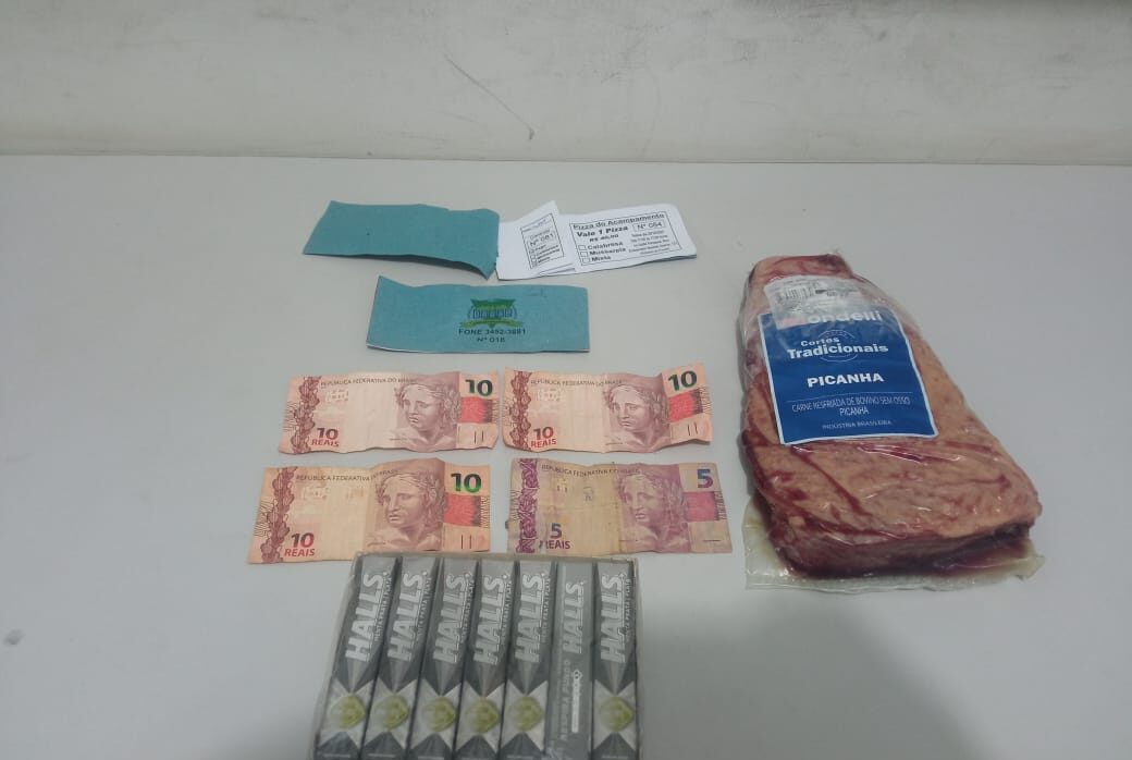 Na abordagem, ele estava com uma sacola verde, onde havia uma peça de picanha, uma caixa de Halls com 21 unidades, dois carnês de venda de pizza e R$ 35.