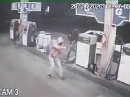 Poucos segundos depois, os dois voltam correndo para o carro e o veículo deixa o posto em alta velocidade.