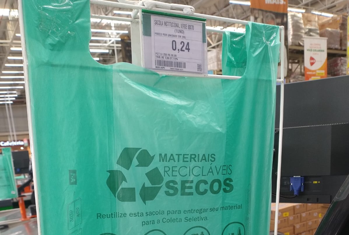 Reportagem do MN revelou que essas sacolas, vendidas por valores entre R$ 0,13 e R$ 0,24, são produzidas com Polietileno de Alta Densidade (PEAD) — o mesmo material das sacolas brancas anteriormente proibidas.