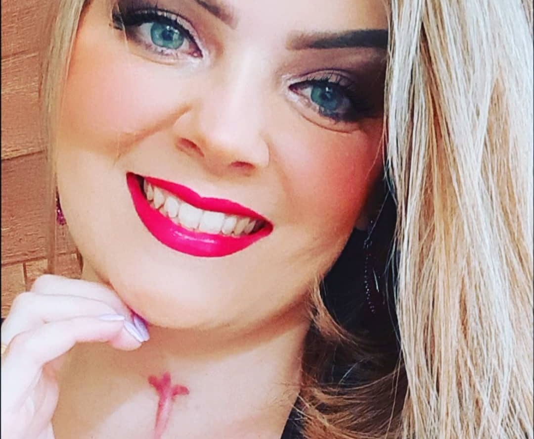 Recuperada, Débora exibe o sorriso com a marca deixada pela traqueostomia; para ela, é uma “marca da promessa de Deus” (Foto: Arquivo Pessoal)