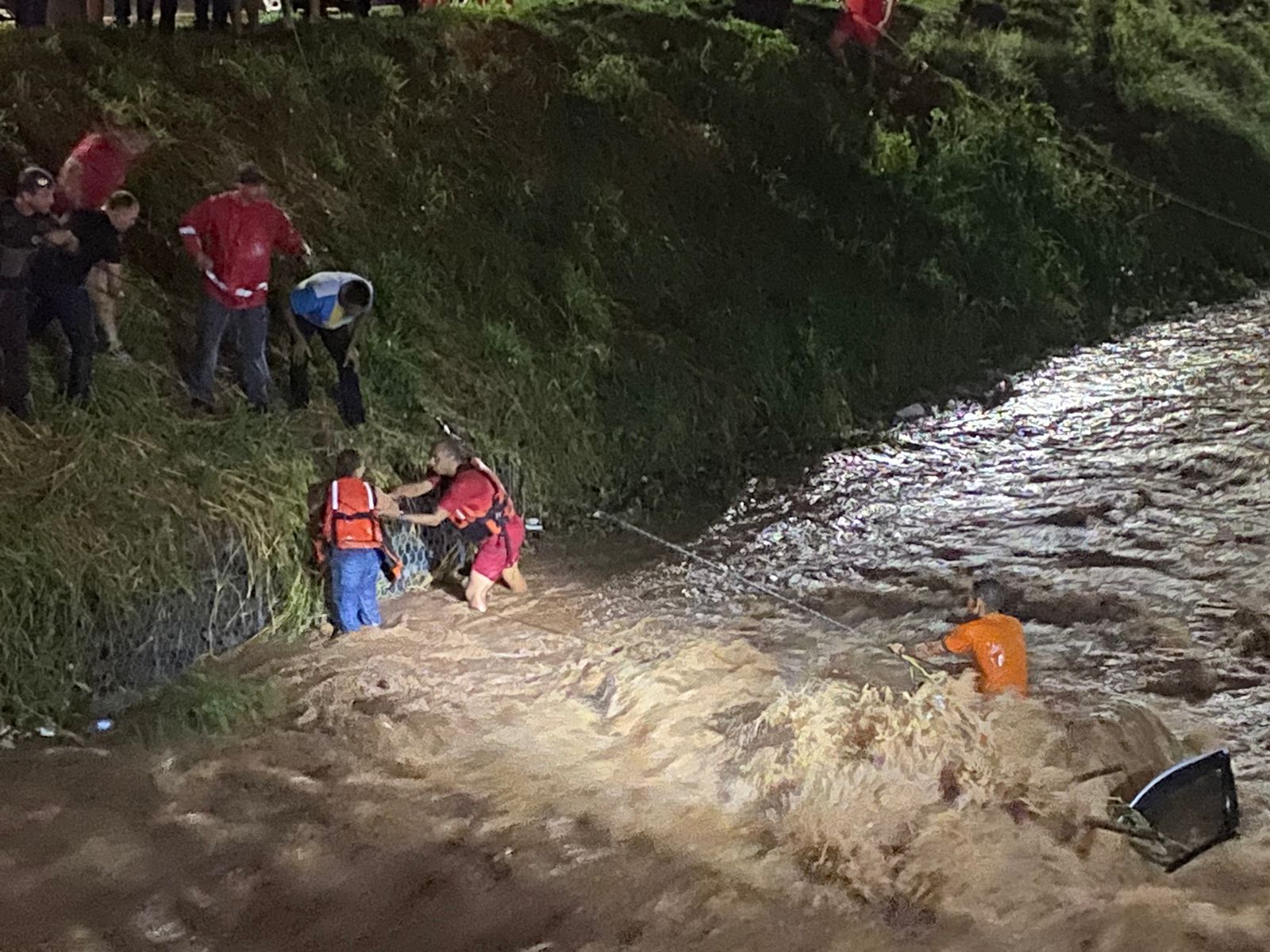 Por meio das cordas, os bombeiros conseguiram passar dois coletes salva-vidas para a mulher e para o homem. A correnteza aumentava a cada minuto, ficando cada vez mais arriscado o socorro.