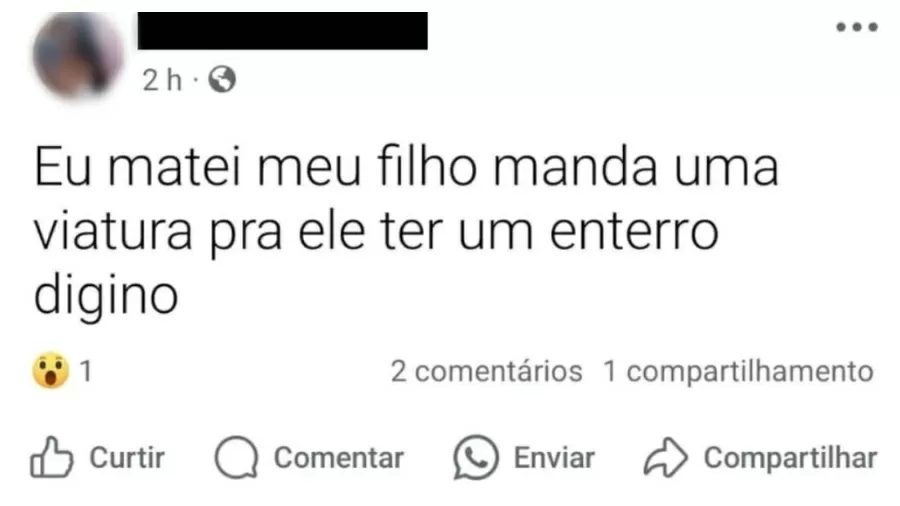 Mãe postou sobre o crime no Facebook e pediu que chamassem a polícia. “Eu matei meu filho. Mandem uma viatura para ele ter um enterro digno”, escreveu a mulher.