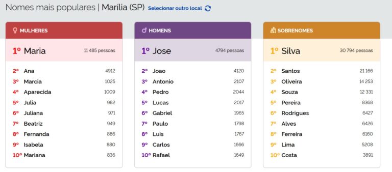 Maria, José e Silva continuam no topo da preferência dos marilienses quando o assunto é nome civil. O Instituto Brasileiro de Geografia e Estatística (IBGE) divulgou nesta terça-feira (4) a nova edição do levantamento “Nomes no Brasil”, com base nos dados do Censo Demográfico 2022, incluindo pela primeira vez o ranking de sobrenomes. Em Marília, os resultados acompanham a tendência nacional.