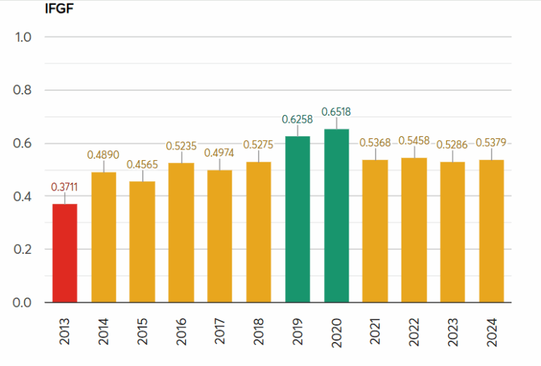 A análise das últimas edições do IFGF mostra que Marília tem oscilado ao longo dos anos. O melhor desempenho foi em 2020, quando a nota chegou a 0,6518, colocando o município na faixa de “boa gestão”. Desde então, o índice recua e se mantém na zona de dificuldade.
