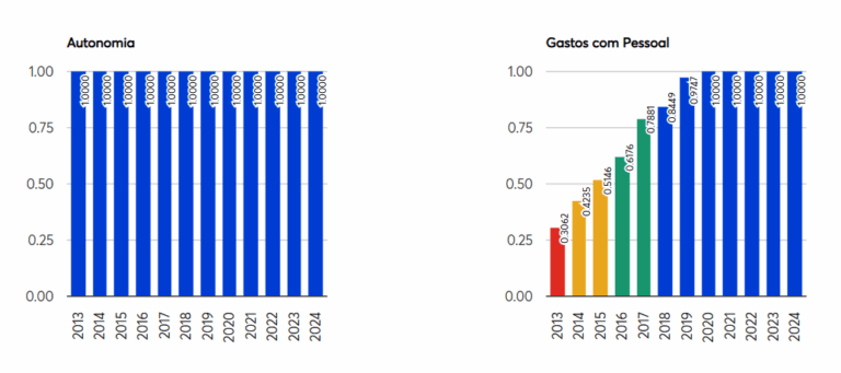 O IFGF é composto por quatro critérios: autonomia, gastos com pessoal, liquidez e investimentos. Marília atingiu nota máxima em autonomia (1,0000) e em gastos com pessoal (1,0000), o que indica que a cidade arrecada o suficiente para manter sua estrutura administrativa e não compromete em excesso o orçamento com a folha de pagamento.