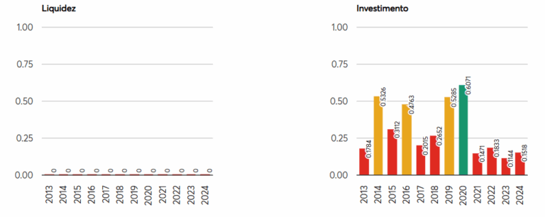 Por outro lado, o município zerou no quesito liquidez (0,0000), evidenciando que não mantém recursos em caixa para honrar obrigações de curto prazo. Além disso, registrou desempenho crítico em investimentos, com apenas 0,1518, um dos piores índices da série histórica.