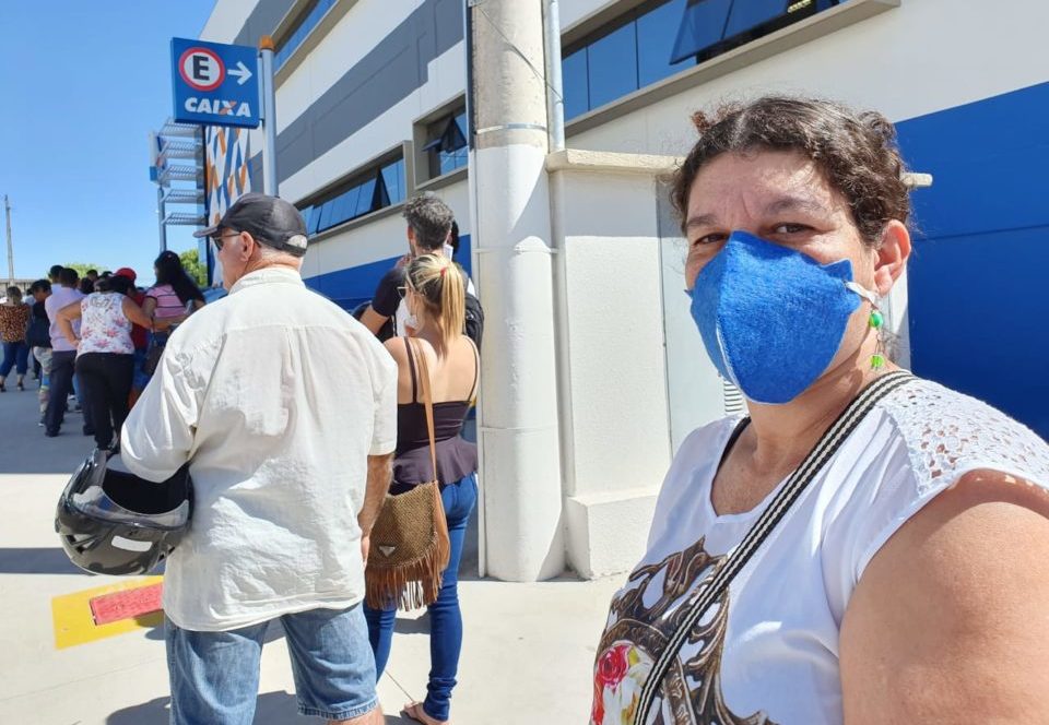 Sandra de Souza reclama do tempo de espera debaixo de sol e com aglomeração de pessoas na Caixa (Foto: Leonardo Moreno/Marília Notícia)