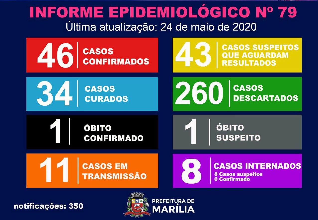 O boletim oficial da Prefeitura de Marília confirmou neste domingo (24) mais cinco casos positivos e a cidade soma agora 46 pacientes confirmados para Covid-19. O município também contabiliza uma morte pela doença provocada pelo novo coronavírus e um óbito suspeito.