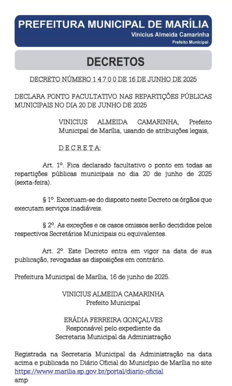 A Prefeitura de Marília divulgou nesta semana o esquema de funcionamento dos serviços públicos durante o feriado prolongado de Corpus Christi, entre os dias 19 e 22 de junho (quinta a domingo).