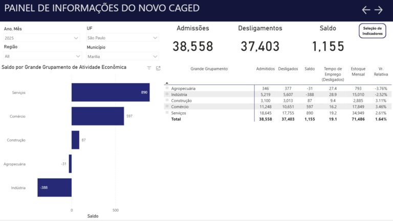 A análise setorial indica que o principal motor da economia mariliense em 2025 foi o setor de Serviços, responsável por um saldo positivo de 890 vagas. Na sequência, o Comércio também apresentou resultado expressivo, com 597 novos postos. A Construção Civil contribuiu com 87 vagas. Em sentido oposto, a Indústria foi o destaque negativo do ano, ao encerrar o período com déficit de 388 vagas, seguida pela Agropecuária, que fechou com saldo negativo de 31 postos.