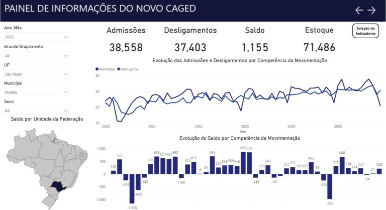 No acumulado de janeiro a dezembro de 2025, Marília contabilizou 38.558 admissões e 37.403 desligamentos, o que resultou em um saldo positivo de 1.155 novos postos de trabalho. Com esse desempenho, o estoque total de trabalhadores com carteira assinada na cidade chegou a 71.486.
