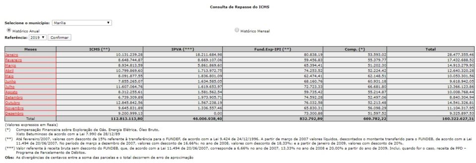 Dados da Secretaria da Fazenda e Planejamento mostram que em 2019, até o momento, o município de Marília já recebeu mais de R$ 160 milhões em repasses de impostos do Governo do Estado. Ao todo foram repassados R$ 160.322.627,31, o valor corresponde é maior do que o arrecadado em 2018 todo.