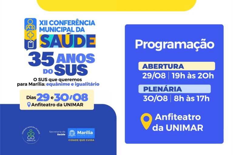 A Prefeitura de Marília promove, nos dias 29 e 30 de agosto, a 12ª Conferência Municipal da Saúde. O evento será realizado no Anfiteatro da Universidade de Marília (Unimar), em parceria com o Conselho Municipal de Saúde (Comus), e terá como tema central “35 anos do SUS, o SUS que queremos para Marília: equânime e igualitário”.