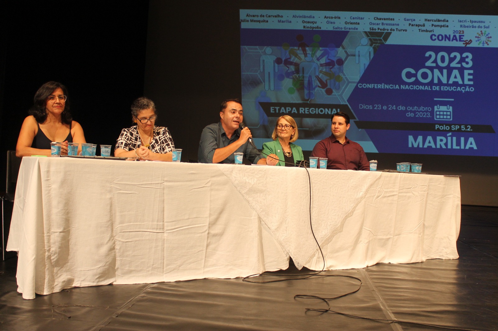 A solenidade de abertura ocorreu na noite de segunda-feira (23), no Teatro Municipal ‘Waldir Silveira Mello’, e reuniu diversas autoridades locais, a exemplo do secretário municipal da Educação, professor Helter Bochi – que na ocasião representou o prefeito de Marília, Daniel Alonso, dirigente regional de ensino de Marília, professora doutora Ana Luiza Bernardo Guimarães, presidente do Conselho Municipal de Educação, professor Marcelo de Souza Fermino, secretária municipal da Educação de Garça, professora Janete Aparecida Barros Arranha Conessa e a professora Flávia Lopes de Cerqueira Gimenes de Oliveira, coordenadora da comissão que organizou a etapa regional da conferência nacional.