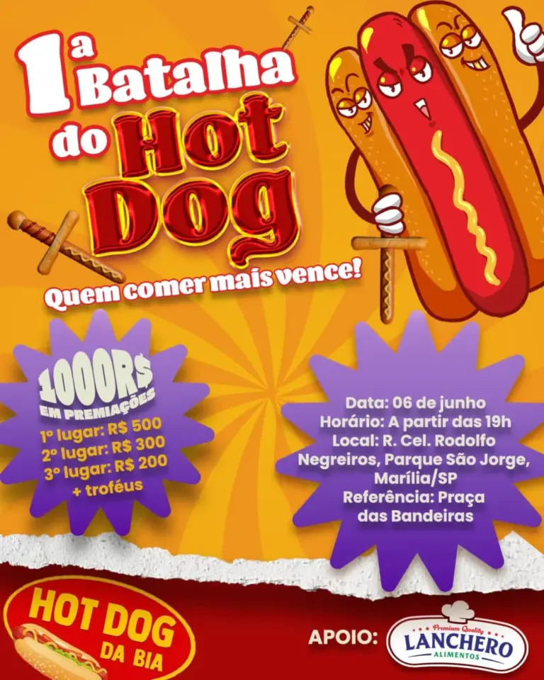 Marília será palco de um evento inusitado e que promete ser divertido no dia 6 de junho, com a 1ª Batalha do Hot Dog, uma competição gastronômica que promete agitar o Parque São Jorge, na zona sul da cidade. A disputa será realizada na rua Coronel Rodolfo Negreiros, a partir das 19h, na Praça das Bandeiras.