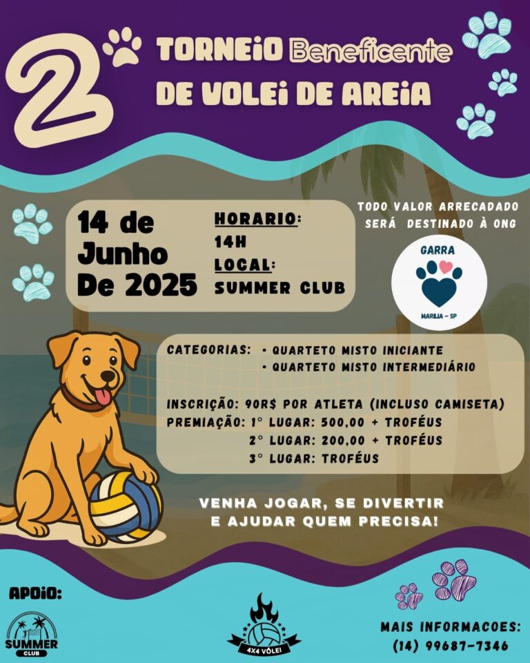 Marília recebe a segunda edição do Torneio Beneficente de Vôlei de Areia no dia 14 de junho de 2025, evento esportivo com foco na solidariedade e no bem-estar animal. A competição será realizada às 14h, no Summer Club, com toda a arrecadação revertida para a ONG Garra, entidade que atua na proteção de animais abandonados na cidade.