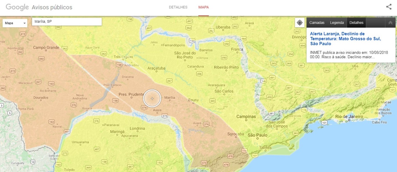 Ao todo, 227 municípios fazem parte da lista em que Marília Aparece. Outras áreas do Sul e Sudeste do Brasil foram enquadradas no alerta amarelo, intermediário entre o laranja e a situação verde, de normalidade, ou “nada previsto”.