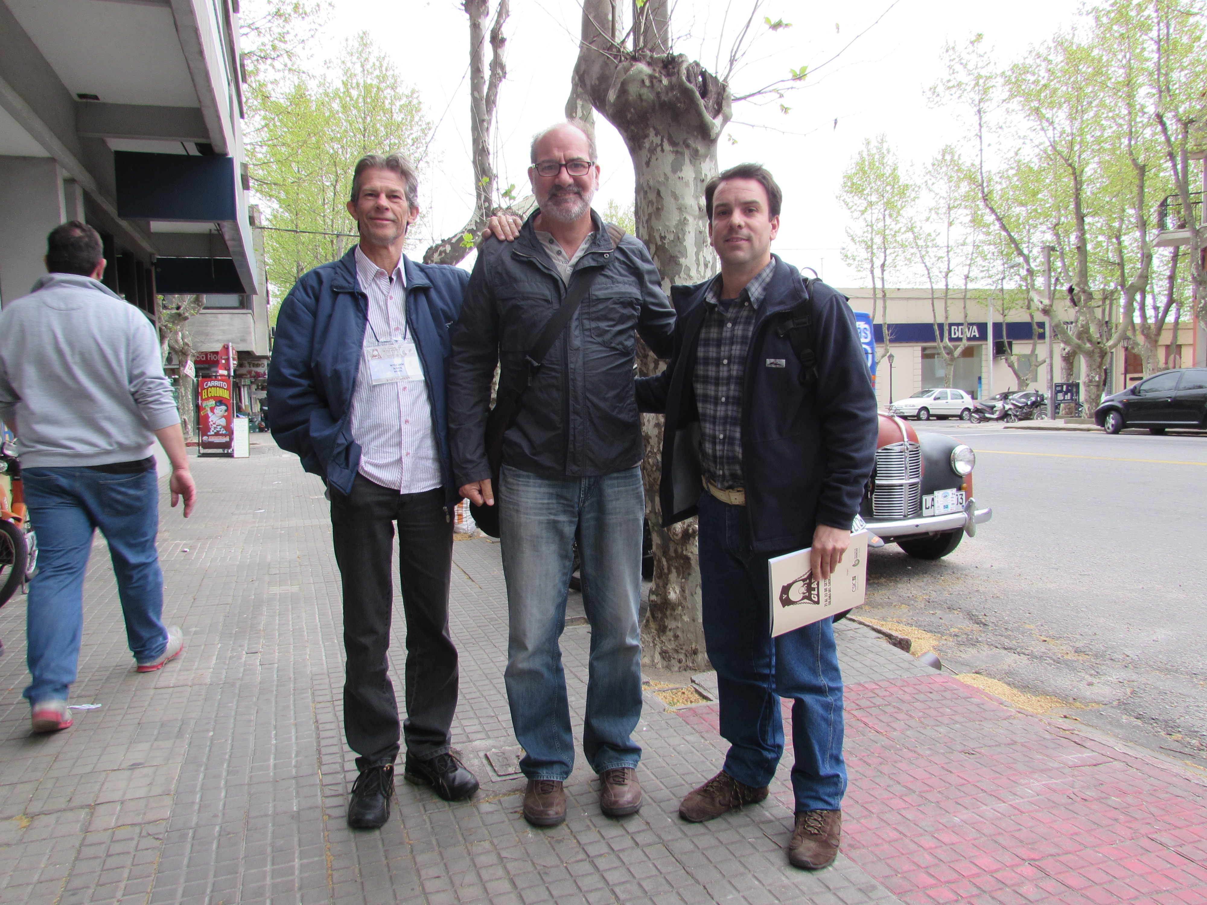 William Nava e os paleontólogos Luis Chiappe (centro) e Agustin Martinelli, durante Congresso de Paleontologia no Uruguai em 2015.