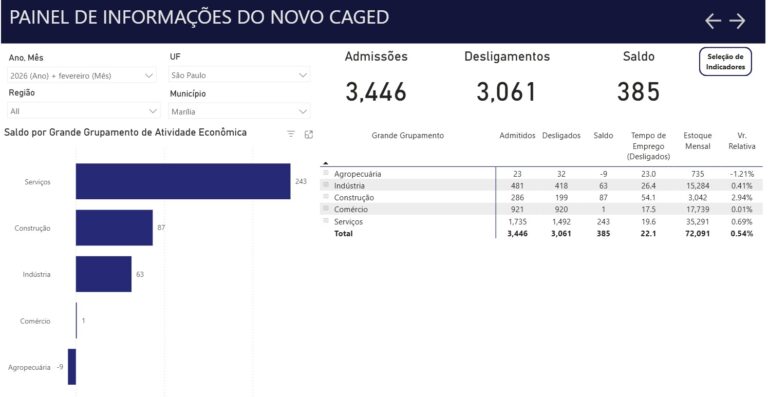 O mercado de trabalho formal em Marília apresentou resultados positivos neste início de ano. Dados do Painel de Informações do Novo Caged indicam que o município manteve o ritmo de criação de empregos com carteira assinada, impulsionado principalmente pelo setor de serviços.