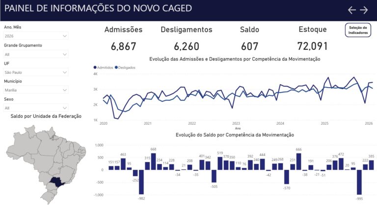 No acumulado de 2026, o cenário também é favorável. No primeiro bimestre, entre janeiro e fevereiro, Marília registrou saldo total de 607 vagas.
