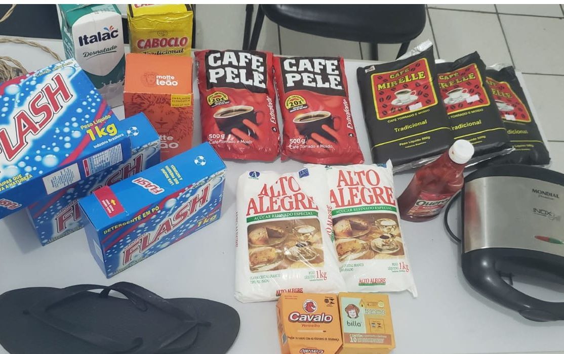 No interior das sacolas estavam vários produtos alimentícios, sabão em pó, sanduicheira, entre outras mercadorias. Foi localizado no bolso da blusa do homem três cartuchos de revólver, calibre 38 íntegros.
