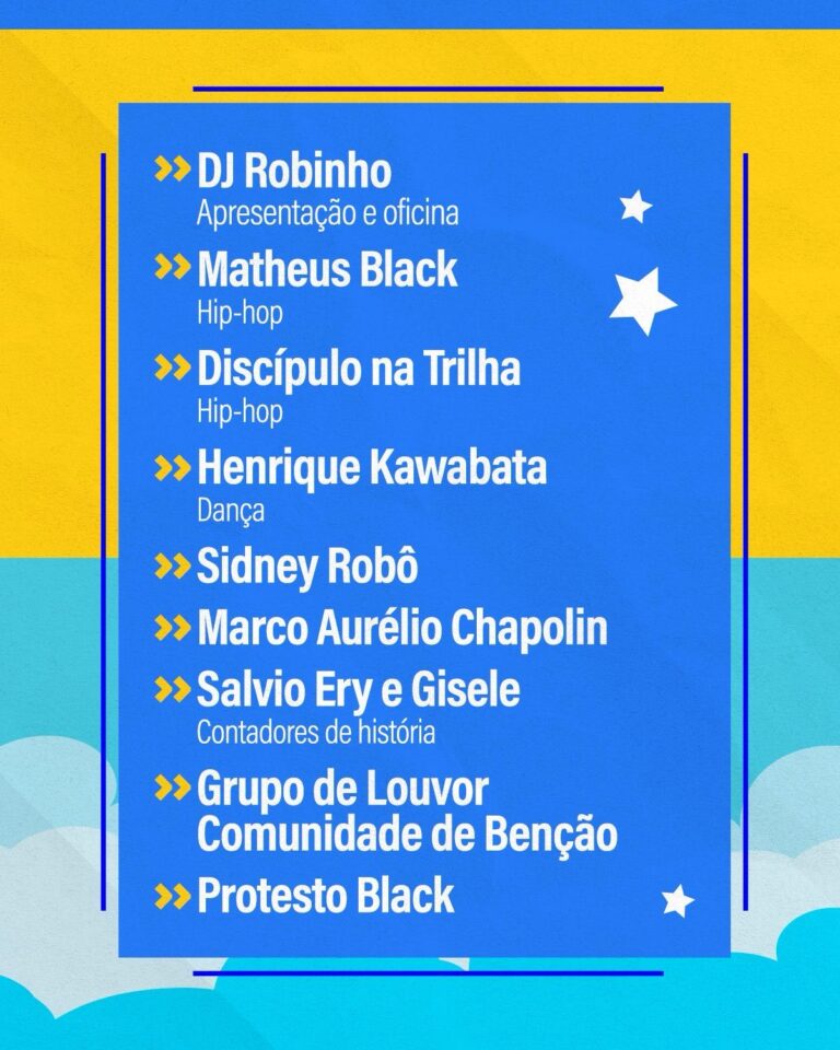 A programação ainda contará com DJ Robinho (apresentação e oficina), Matheus Black e Discípulo na Trilha (Hip-hop), Henrique Kawabata – dança, Robô, Chapolin, Salvio Ery e Gisele- Contadores de história e Grupo de Louvor Comunidade de Benção.