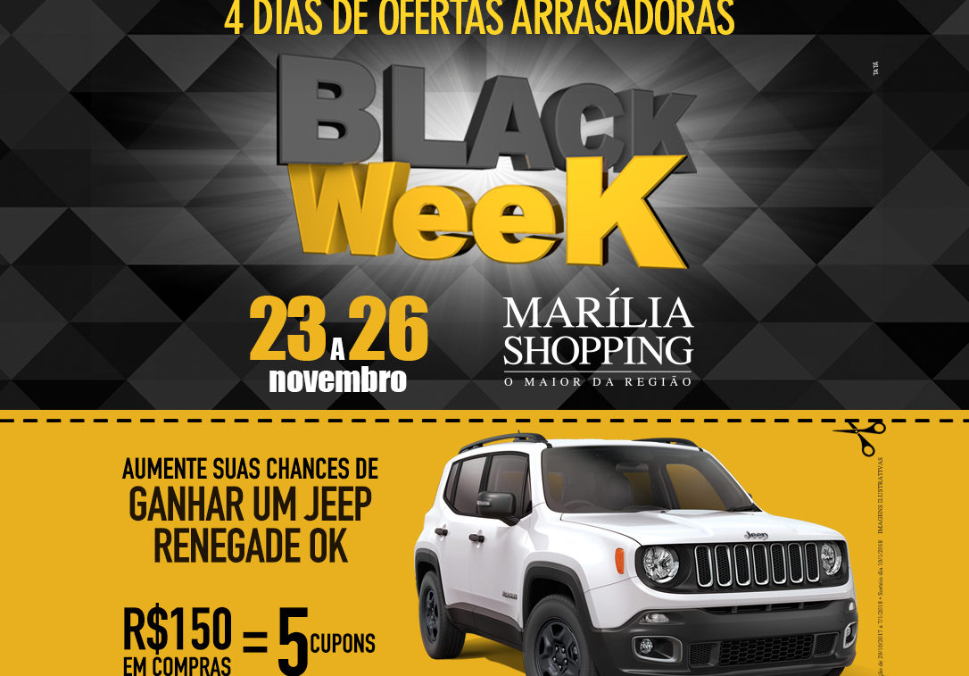 Além de antecipar as compras de Natal, os clientes também podem participar da campanha promovida pelo Marília Shopping e concorrer a um Jeep Renegade 0km. Para tornar a experiência em compras ainda melhor e aumentar as chances de ganhar, durante a Black Week, a cada R$ 150 em compras, o cliente receberá cinco cupons para concorrer. O regulamento completo da promoção pode ser consultado no ponto de troca ou no endereço: www.mariliashopping.com.br