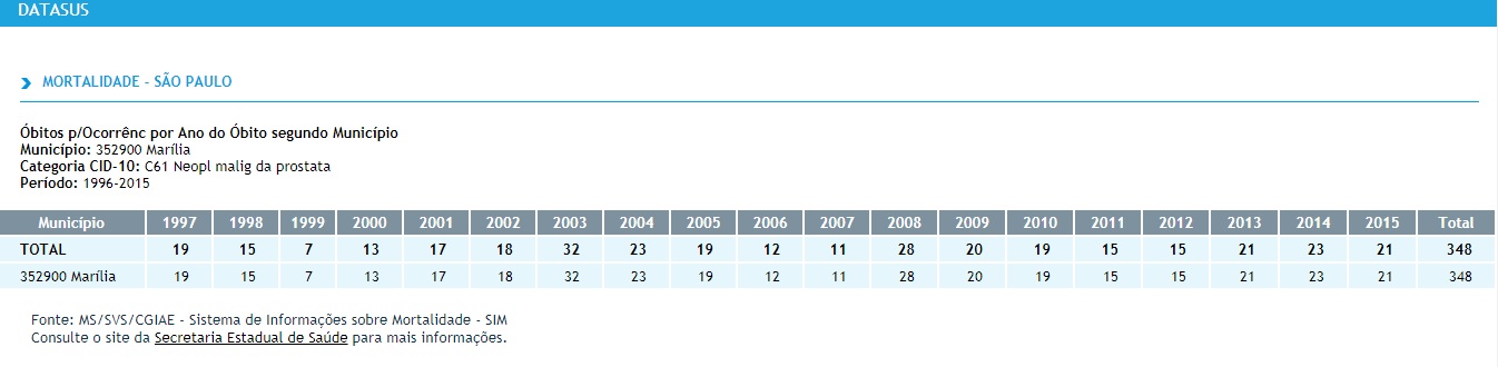 Marília registrou 348 mortes provocadas pelo câncer de próstata entre 2006 e 2015, período com dados disponíveis para consulta no DataSUS (Departamento de Informática do Sistema Único de Saúde). A média fica em pouco mais de 17 mortes por ano.