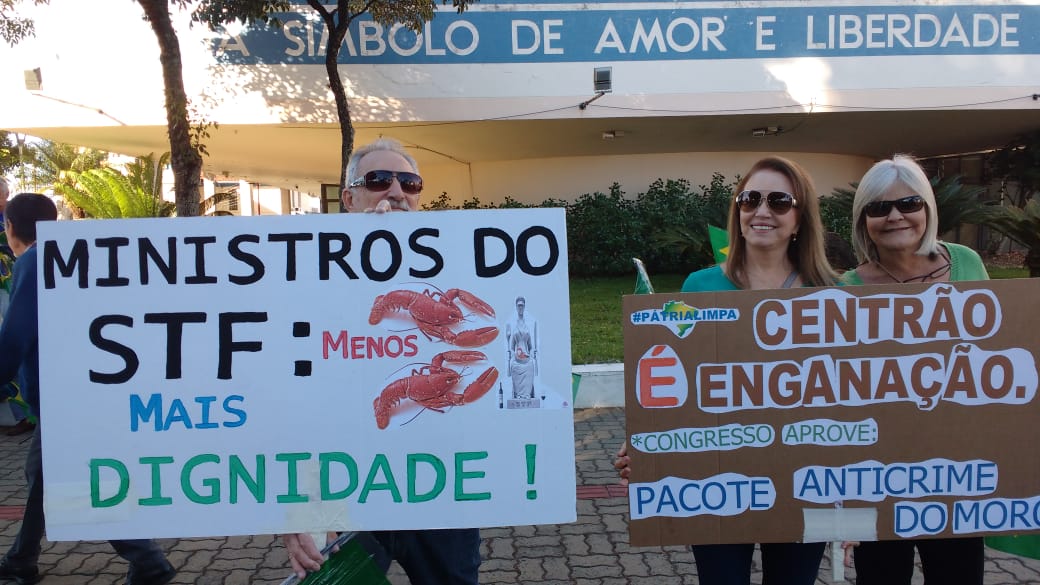 “Com o povo não tem conchavo, reformas já!” e “STF gaiola das loucas” eram algumas das mensagens escritas. “Força Bolsonaro”, “Verás que um filho teu não foge à luta” e “Meu partido é o Brasil” também eram frases que podiam ser lidas.