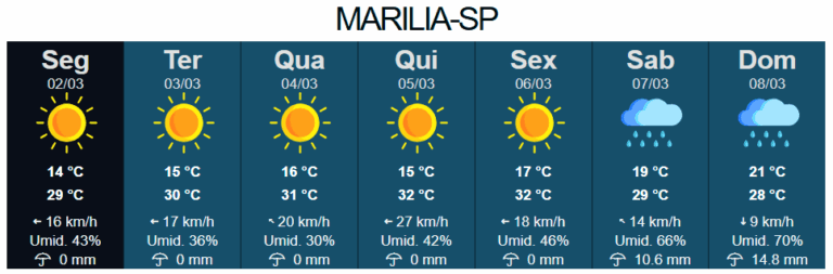 A semana começou com predomínio de sol em Marília e deve seguir com tempo firme e temperaturas amenas nos próximos dias. A previsão é do Instituto de Pesquisas Meteorológicas (IPMet), de Bauru, com base em dados de satélite coletados nas últimas horas, sujeitos a alterações.