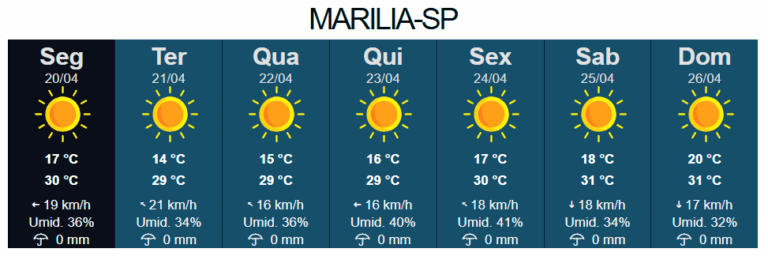 Marília amanheceu ensolarada nesta segunda-feira (20), início da última etapa do feriado prolongado. A previsão indica manutenção do tempo firme até terça-feira (21), quando se encerra o período de descanso.