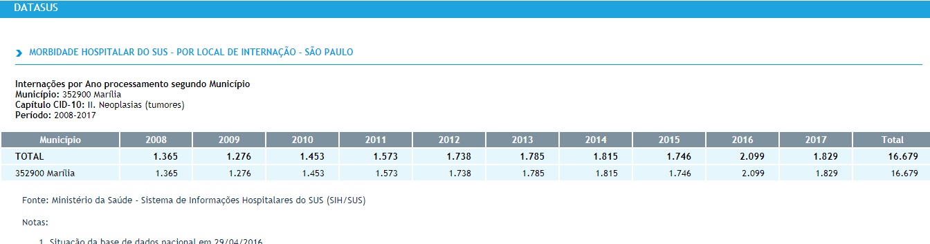 O órgão vinculado ao Ministério da Saúde mostra que no ano retrasado, em 2016, foram 2.099 internações de pacientes em decorrência dos variados tipos de neoplasia no município: 270 casos a mais do que em 2017.